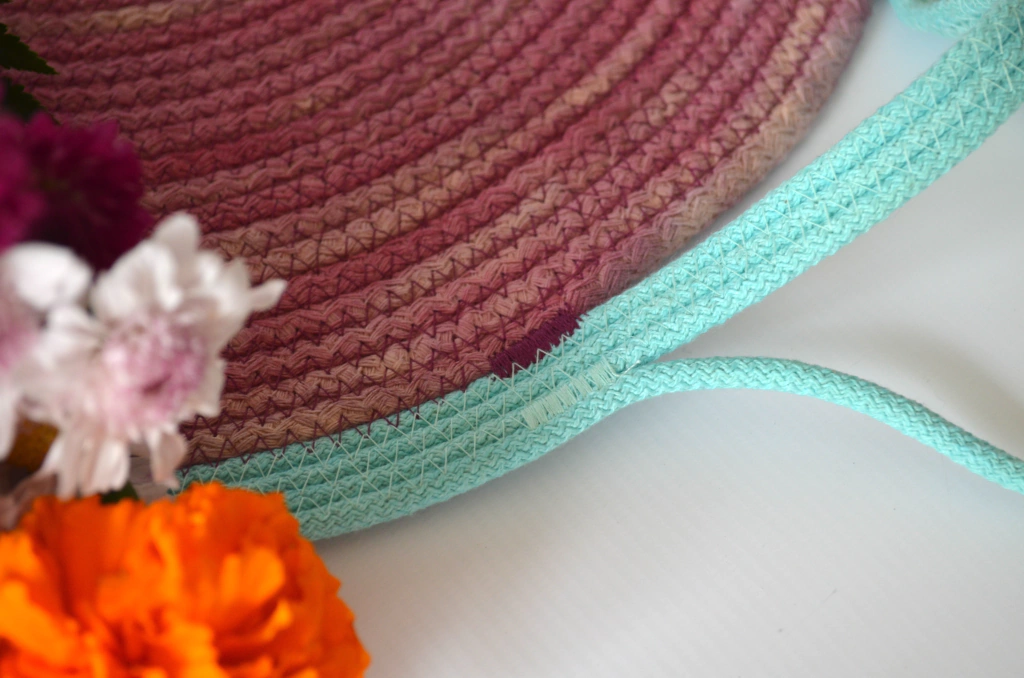 Realizada en cordón de algodón de 6 a 8 mm, la cesta se tiñe artesanalmente con una variedad de tintes naturales provenientes de plantas, especias y otros elementos vegetales. Este proceso no solo aporta colores únicos y vibrantes, sino que también respeta el medio ambiente y las raíces tradicionales del teñido natural.